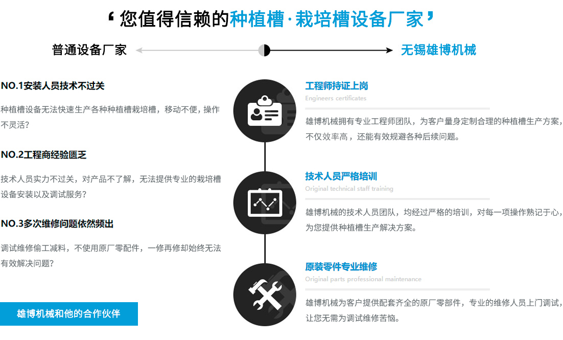 您在選擇雄博產品的同時,也選擇無微不至的終身服務??筛鶕?jù)不同客戶實際需求進行種植槽設備,栽培槽設備等的特殊工藝設計制造專業(yè)一對一售前/售后/技術咨詢指導,享受更貼心/放心的設備使用體驗。
